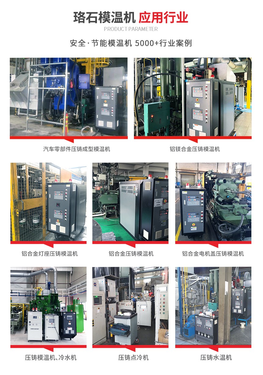 壓鑄行業(yè)使用壓鑄模溫機(jī)來提升工藝質(zhì)量、提高生產(chǎn)效率、改善壓鑄件質(zhì)量,使用壓鑄模溫機(jī)能夠有效地延長壓鑄模具的使用壽命,節(jié)約企業(yè)成本。